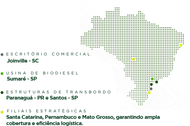 Produção de biodiesel e comercialização de óleos e químicos. Buscar excelência operacional e satisfação dos clientes, assim como, valorizar a ética e o mérito no trabalho. Atuar de forma responsável social e ambientalmente, objetivando solidez financeira e desenvolvimento humano.